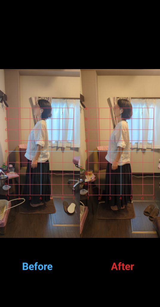 ビフォーでは、耳の位置はくるぶしからのライン上にあるように見えますが、お首がお疲れで頭が後ろに倒れていることから見えていますが、アフターでは、整っていらっしゃいます。