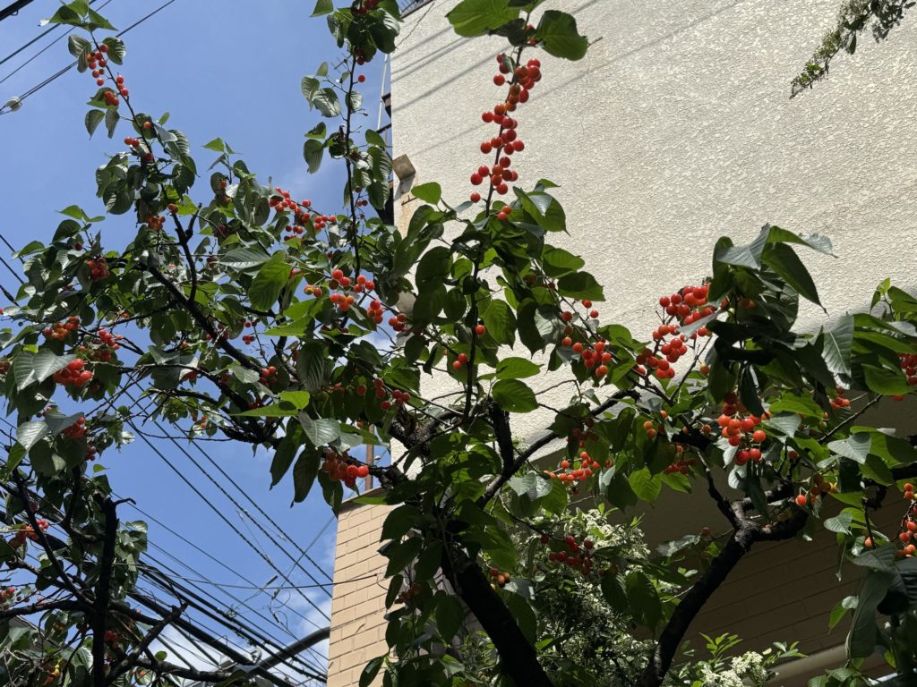 帰宅後途中、さくらんぼがたくさん実っているお宅があり、さくらんぼってこうやって実が付くんですね。