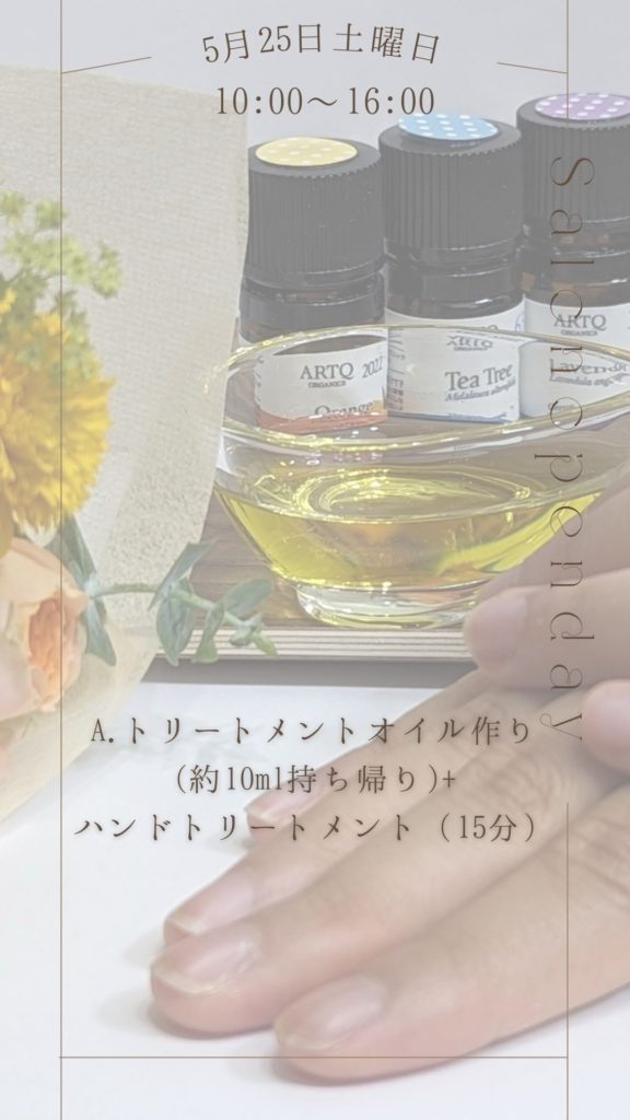 さて、今日は今月のサロンオープンday【トリートメントオイル作り(10mlお持ち帰り)+ハンドトリートメント(15分)】のご案内です。