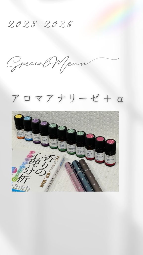 🌹ご自分の望む未来、望んでいること香りが教えてくれる”香りの心理分析【アロマアナリーゼ】”と、選んだ香りを使ったボディトリートメントがメニューになっている【アロマアナリーゼトリートメントボディ90分】をご用意しております。